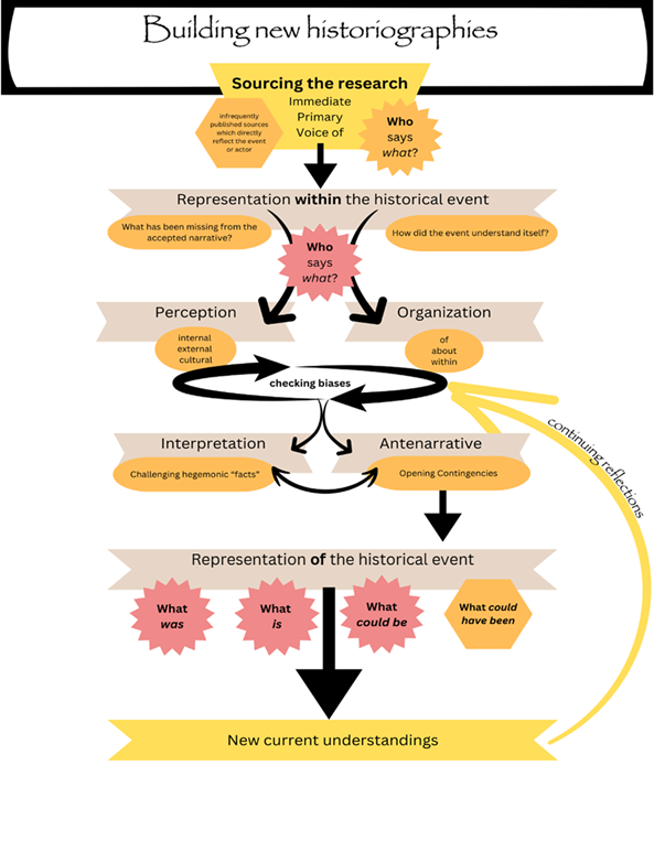 Naturally, primary sources are not always available. When this is the case, researchers must begin to apply a critical lens immediately, questioning their use of sources, the source authors or publishers, and the ready availability of sources. This is to say that the source(s) used must reflect a diverse population, differing voices, and perhaps 'ought' to be less readily accessible; readily accessible sources are the result of a pushed or previously accepted narrative, perpetuating the hegemonic ideal rather than examining a concurrent historical possibility. The argument that one must be careful not to simply echo or reproduce knowledge, but must consistently question and evaluate ‘truth’, is not singular to this paper (Cluxton & Horst, 2019; Teich, 2015; Williams, 2020). When ‘knowledge’ is simply reproduced, contingencies for broader understanding close. Primary source(s), then, become paramount as a means to offer a starting point to analyze how an event was represented at the time, by voices directly involved or directly watching said event (primary or secondary sources). This 'representation within' may include a singular source, such as an official event report, or several sources, such as a compilation of articles, biographies and autobiographies, and other pieces of data, that offer a Pointillist approach to storyline construction.
